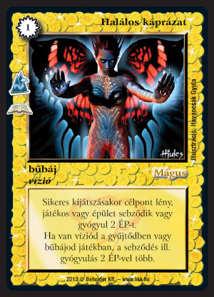 Halálos káprázat (6): Az abc sorrend alapján előre kerültek a varázslatok. Sebaj, legalább egyben le tudjuk őket, utána jöhetnek a legendás lények. A halálos káprázat az előző Fezmin gépezetéhez hasonlóan, nem egy verseny spoiler. Egyért kettőket sebző vízió szerintem erősen a kuka kategória, még akkor is, ha lénybe, épületbe és játékosba is tud sebezni. Két éve jött ki A főnix tüze, ami kettőért hármat sebez, elvétve látni néha, de csakis azért, mert tűzvarázslat, így a tüzes paklikba - amik közül elsősorban a Bűvös erdő verzió volt egy ideig versenyképes - befért. A Halálos káprázat általános helyett bűbáj, ami előny, mivel marad egy áldozható lapunk, de szerintem valami nagyon speciális versenyen kívül csak vízióm pakliban fogjuk viszont látni, mivel ott egyért négyet sebez, és még mindig van egy áldozható lapunk. Sajnos a vízió pakli manapság nem elég erős versenyre. Ennek szerintem több oka is van. Egyrészt elterjedtek a semmizések, másrészt a drágítás és a laphúzás letiltása (börtön, bilincs stb.) eléggé betesz neki. Harmadrészt a víziók önmagukat hátráltatják. Ha ugyanabból a vízióból egynél több lap van a kezemben és/vagy a gyűjtőmben, akkor ezek a lapok blankok, nem használhatóak. Ez persze régen is így volt, csak a vízió pakli a maga fénykorában a többi paklinál gyorsabban pörgő, gyorsabban kiépülő pakli volt, emiatt volt életképes. Manapság ez már sajnos nem igaz. Összességében szerintem ez a lap nem elég jó, hogy vízió paklin kívül máshova bekerüljön, oda pedig maximum kettőt raknék be belőle, de lehet, hogy csak egyet. Hármat semmiképpen sem.
