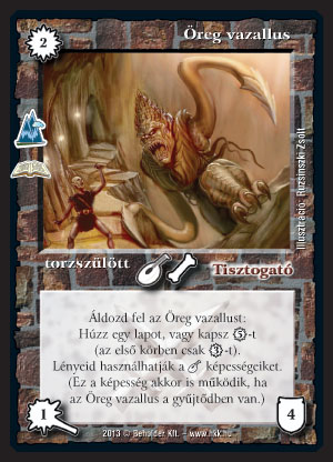 Öreg vazallus (10): Tudom, a lapértékelés nagy könyve szerint 10 pont csak a Kyorg tudáshoz hasonló univerzális lapoknak jár. Én mégis 10-et adok erre a lapra. Lehet, hogy kicsit túlértékelem, de legendás pakliban keltető mellett első körben ad 3 VP-t, amiből kiépülhet a pakli. Később 1-ért ad 5-öt, ha pedig nem kell már varázspont, húzok helyette egy lapot. Mindezek mellett még a legendás képességet is biztosítja a lényeimnek, ha leszedik a követőt, vagy ha nem legendás paklival játszom, de akad 1-2 legendás lényem. Nagyon jó lap.