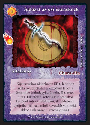 Na jó, most már elárulhatom, hogy a tegnapi lap csupán bemelegítés volt, akad itt ugyanis egy kőkemény zanszilánkos spoiler, egy másik egykoron legendás lap felújítása: íme az új Áldozat az ősi isteneknek. Nézzük meg, mit is tud önmagában: 4 zanszilánkért megszabadítja az ellenfelet 2-2 lapjától az asztalról és a kezéből, emellett pedig sebez is 2-t. Nem rossz, de ahogy a réginek, úgy ennek is a konfigurálhatóságban rejlik az ereje: néhány lap befektetésével könnyedén kidobathatjuk ellenfelünk kezét, de ne feledjük a Chara-din követője által termelt fattyakat se, melyeket beáldozva még egy komolyabb asztalt is eltüntethetünk az Áldozatnak hála. Jóbarátja lesz még emellett a különféle Zarknodos, illetve Korlátozásos pakliknak is, ahol az erősen korlátozott környezetben általában önmagában is képes lesz az "asztal-kéz" hadműveletre, de egy-két darab lényegében bárhol felbukkanhat majd belőle, ahova befér a lila szín.