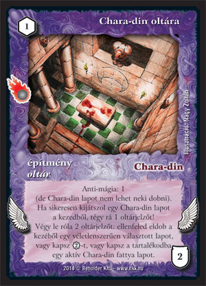 A kissé gyengécske Leah oltárát követően a nagyjából hasonló koncepció mentén készült A fény oltára és Sheran oltára igen szép kis karriert futott be, és esélyes, hogy a Chara-din oltára is valami hasonlóra számíthat. Az ingyenes anti-mágia itt is kiváló kezdés lesz a követő mellé, képességei pedig remekül kiegészítik egymást, hiszen a dobatás, a 2 VP vagy az extra fatty valamelyikére a játék minden szakaszában szükség lesz. Fontos, hogy bármilyen Chara-din lapra kapja a jelzőt, nem csak a lényekre, így a varázslatok is remekül működnek mellette. Két ilyennel, meg egy szkritteres-visszavetetgetős művelettel (mondjuk Magzattal) még akár végtelen varázspontot és fattyat is varázsolhatunk magunknak, de ez inkább csak érdekesség, léteznek ennél százszor jobb háromlapos kombók.
