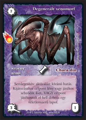 A múlt heti beharangozót követően most is helyet szorítottunk egy semlegesítéses lapnak, amely egyben azt is megmutatja, milyen kiváló lehetőségek rejlenek az új kulcsszóban. A Degenerált xenomorf aktiválást kívánó hatást counterel, ami teljesen új dimenziókat nyit majd meg a játékban (annyit elárulhatok, hogy lesz még néhány ilyen kártya), hiszen az elmúlt 19 év versenylapjaira visszagondolva csak a mára teljesen eltűnő A sors fintora (illetve bizonyos esetekben a Zilak-din főkancellár) tudott hasonlót. Tipikusan olyan lap, amely ránézésre nem feltétlenül tűnik nagy számnak, működés közben azonban megmutatja igazi erejét - gondoljunk csak bele, milyen jól járunk akkor, amikor egy bennünket szorongató Techiánafluxot vagy Tl'urlang tojást tudunk vele megfigurázni. Ezután ráadásul nem csak egy 3/1-es lény marad jutalmul, hanem még meg is szabadítjuk az ellenfelet egy lényétől, egy lapjától vagy néhány életpontjától. Kell ennél több?