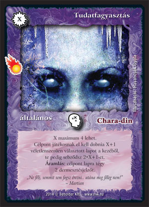 Végezetül lássunk egy színtiszta dobatós kártyát, mely az Áldozathoz hasonlóan szintén egy legendás lap felújítása: az új Tudatfagyasztás már évek óta várt a megjelenésre, ám mostanra jutott csak el odáig a játék, hogy helye legyen a meglévő lapok között. A fő húzóerő itt is a konfigurálhatóság: ha kell, ingyen kiszedhetünk egy lapot az ellenféltől, de akár az is benne van a pakliban, hogy a második körben eltüntetjük a komplett kezét. A költséggel együtt persze a kockázat és az ár is növekszik, hiszen 4 lap dobatásánál már 7 ÉP-be kerül nekünk ez az akció, ami azért manapság nem mondható kevésnek, de hát valamivel fizetnünk kell egy ennyire brutális dobatásért cserébe. Az áramlással osztható dermesztésjelző kiváló alternatíva lesz a leszedéssel nehezen megoldható lapok kikapcsolására, emellett pedig vegyük észre, hogy a mostanában teljesen eltűnt Edralianba is emiatt fog beférni, hiszen a célpont szó miatt kereshető Kisebb káoszsújtással!