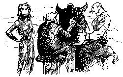 Leérve a jól ismert mitulen füves rudacska bűze és a RAGÁLYTM fanyar illata fogadott. Egy hátsó, homályba burkolózott asztalnál négy alak üldögélt, halkan susmogtak, miközben nagyokat húztak a ragálygombasörös üvegükből, és nagyokat szívtak a fehér rudacskákból. Egy kövérkés alak határozottan ismerősnek tűnt, majd mikor felém fordította (szerinte naiv, szerintem sunyi) ábrázatát azonnal ráismertem: Hiszen ő Csukonyi a Kalmár! Rajta kívül láttam egy karcsú, időtlen arcú, törékeny hölgyet, aki a Mágusok Klánjának jelvényét viselte magán. Vele szemben egy hatalmas termetű, izmoktól duzzadó galetki férfi ült, aki éppen elmélyülten társalgott egy démonarcú, izzó zöld tekintetű, hosszú palástot viselő férfival. Odaléptem hozzájuk, végigmértem őket, és igazi macsós módon rágyújtottam. A mitulen füvet szívva üdvözöltem őket: