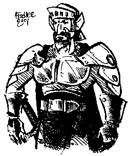 Odaérve a Hippikratosz által mondott helyre egy teljes harci vértbe öltözött, tiszteletet parancsoló tekintetű galetki férfi fogadott bennünket. Ősz kecskeszakállával, karvalyorrával egy valódi hadvezérre emlékeztetett. Gondoltam, valószínűleg ő lesz Rumbold Theofil. Lelkesen szólított meg bennünket: