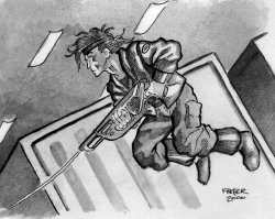 Megbotlom, éppen, mikor Hel elsüti fegyverét. A sugár szétroncsolja a vállam. A padlóra csapódom, és meglátom Zaratát. Az ő testében botlottam el. Szerencsétlen lány éppen így menekülhetett, mint én, de a sugár vízpárává lobbantotta a fejét.
